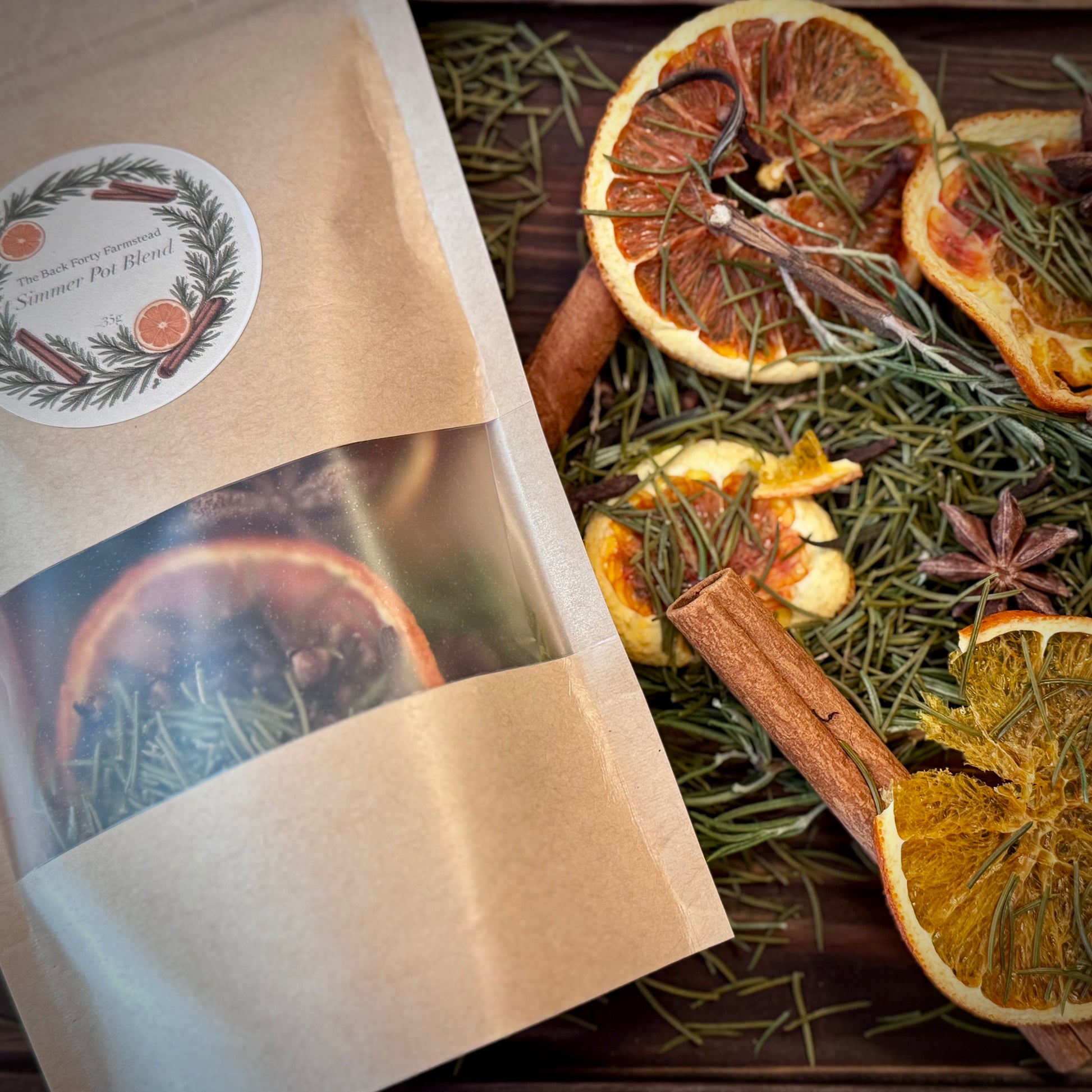 Fill your home with the cozy scents of the holiday season with this handcrafted simmer pot blend. Made with in home dehydrated oranges, rosemary & pine along with whole cinnamon sticks, cloves & star anise - each ingredient is thoughtfully chosen to bring warmth & comfort to your home. Add in cranberries and/ or apples for a pop of color & fragrance.