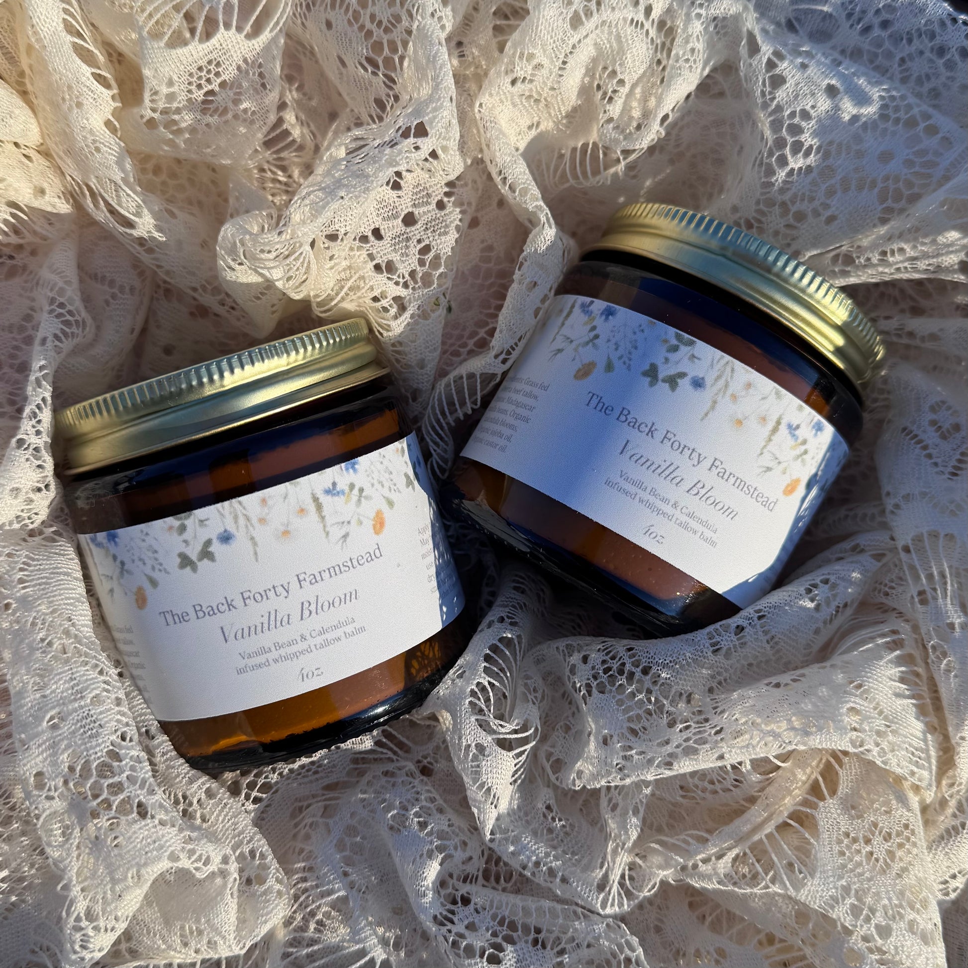 The Vanilla Bloom Whipped Tallow Balm is a versatile skincare product, created to provide deep nourishment for your skin. Organic Madagascar vanilla beans and organic calendula blooms are slow infused on low heat directly into the tallow creating a warm, gentle scent.